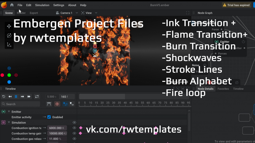 Hello. This is the first part of Embergen source projects for video stock markets. Fire Loop project files, Ink Transitions, Burn Transitions, Shockwaves, Stroke Lines, Burn Alphabet, Stroke Lines